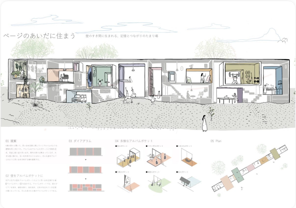 「第12回POLUS-ボラス-学生・建築デザインコンペティション」(主催:ポラス株式会社)において、建築学科2年の清悠空さん、芝優花さん、鈴木凛さんによる「ページのあいだに住まう」がUJ賞(Under Junior award)を受賞しました。