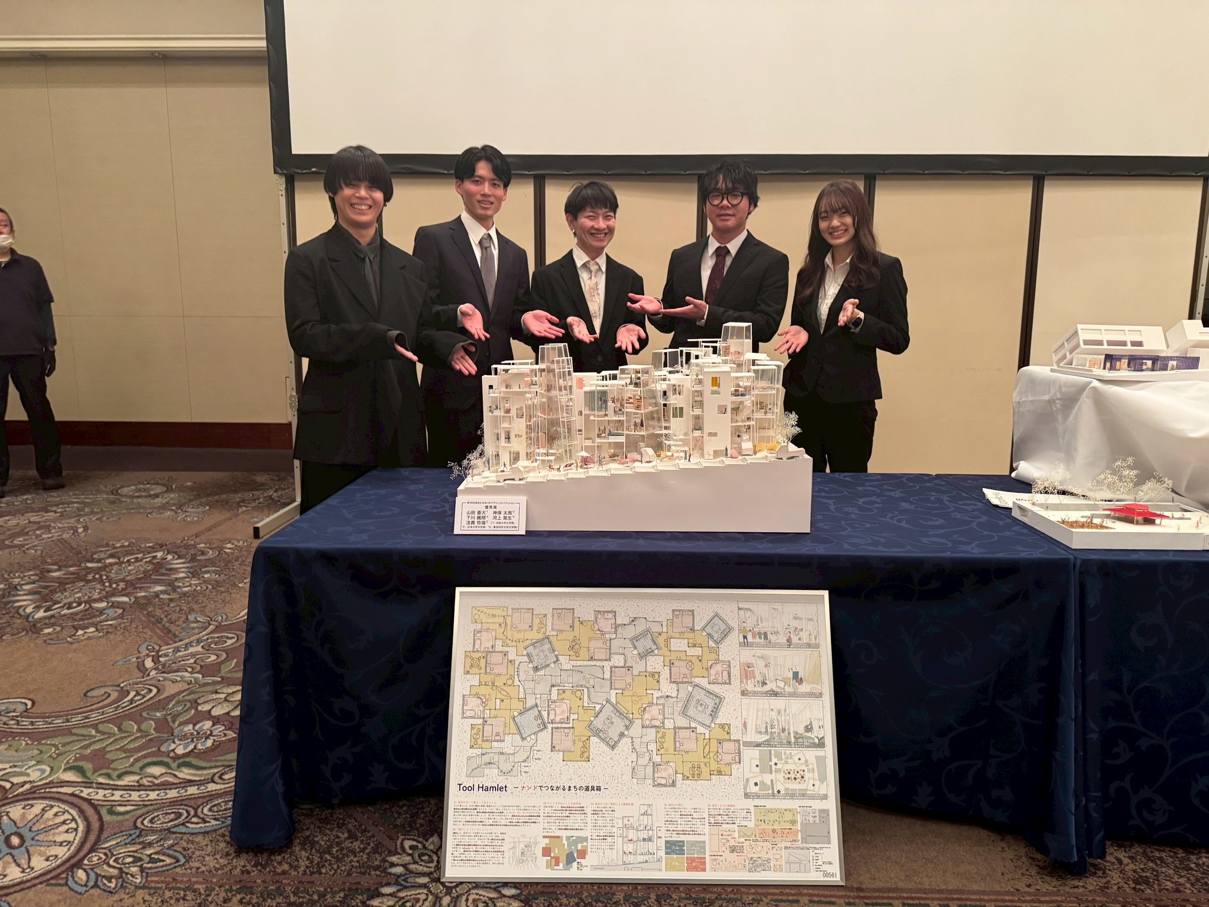 長谷工住まいのデザインコンペティションにおいて、建築学専攻博士前期課程2年の神保太亮さん、河上晃生さん、法貴伶海さん(地域デザイン研究室(山中・三宅ゼミ))と山田蒼大さん(法政大学大学院)、下川楓翔さん(東京科学大学大学院)による「tool Hamlet」 -ナンドでつんがるまちの道具箱-が優秀賞を受賞しました。