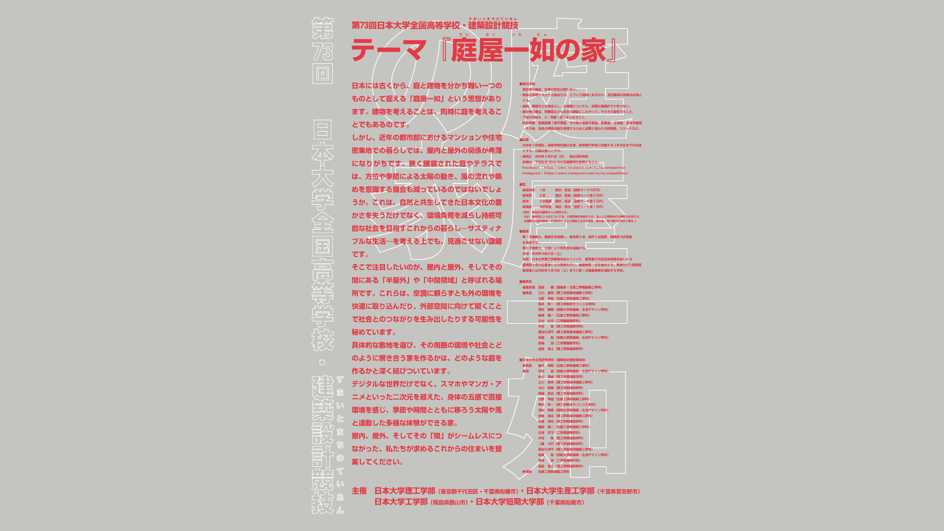 本年は生産工学部建築工学科が幹事校を務め、審査員長を渡邉康(建築家・日本大学生産工学部教授)にお願いし、「庭屋一如(ていおくいちにょ)の家」と題するテーマのもと作品を募集します。